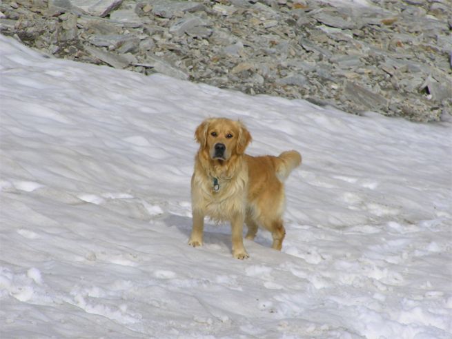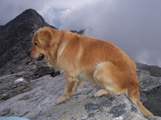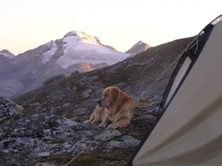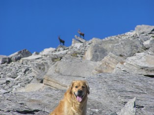 Mein ehemaliger bester Freund und Gefährte Sam. Im Hintergrund sieht man zwei grosse Steinböcke.